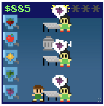 You're a Juice Bartender (Juicetender?) and you have to give juice to the customers. On left are 5 juice containers, the customers will walk up to the tables on the right. Grab the correct juice and give it to the customer. But if you're too slow, or give them the wrong drink, you'll lose reputation and your stars go down.